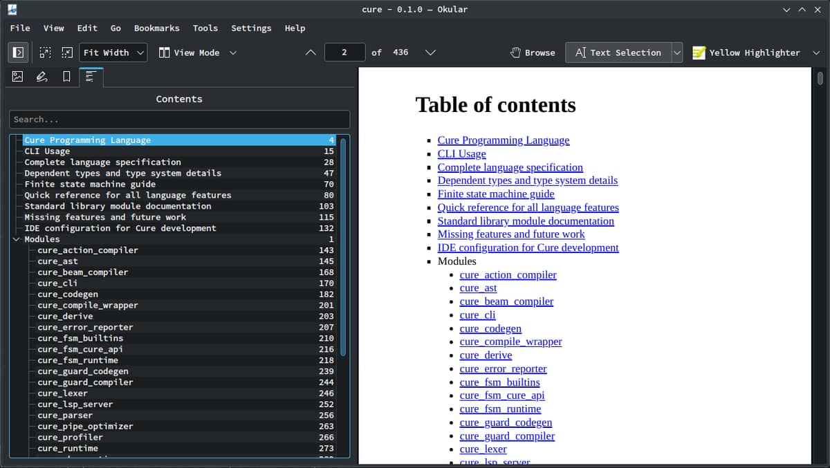 I am extremely impressed by Cure, but no, what I am after is a single PDF file that doesn’t give me RSI clickety-clicking and contains at least getting started, installation guide, tutorial, reference, and library documentation. I do know how very difficult it is to produce good documentation content. When you have it, blasting it into a thousand fragments doesn’t make it better.