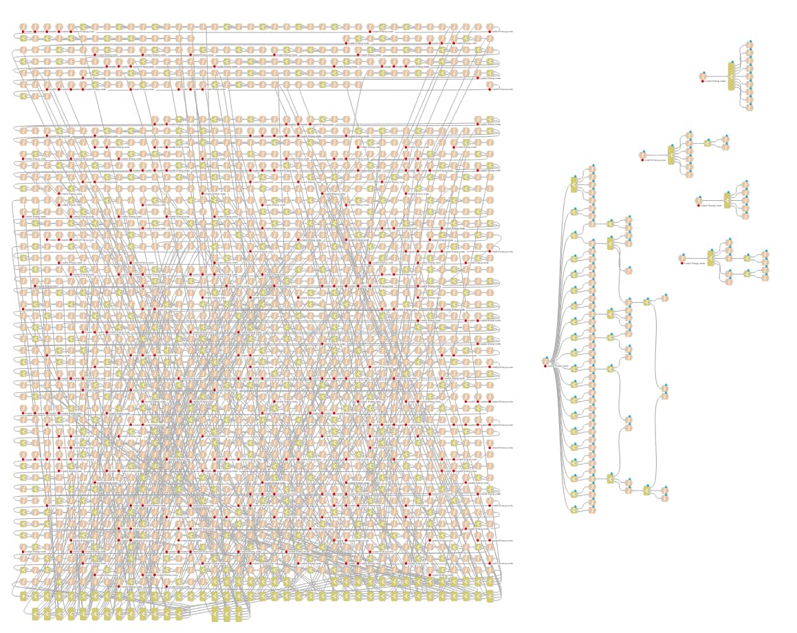 And even here we gain something - bottom right there is a case statement with many branches. So ordering by size already has brought an insight. The red-dots are non-compiled code - the existing code is imported and stored as function nodes inside Erlang-Red. The code gets compiled and the process started. The reason why the code isn’t compiling is because the way the function node works not because the code is incorrect.