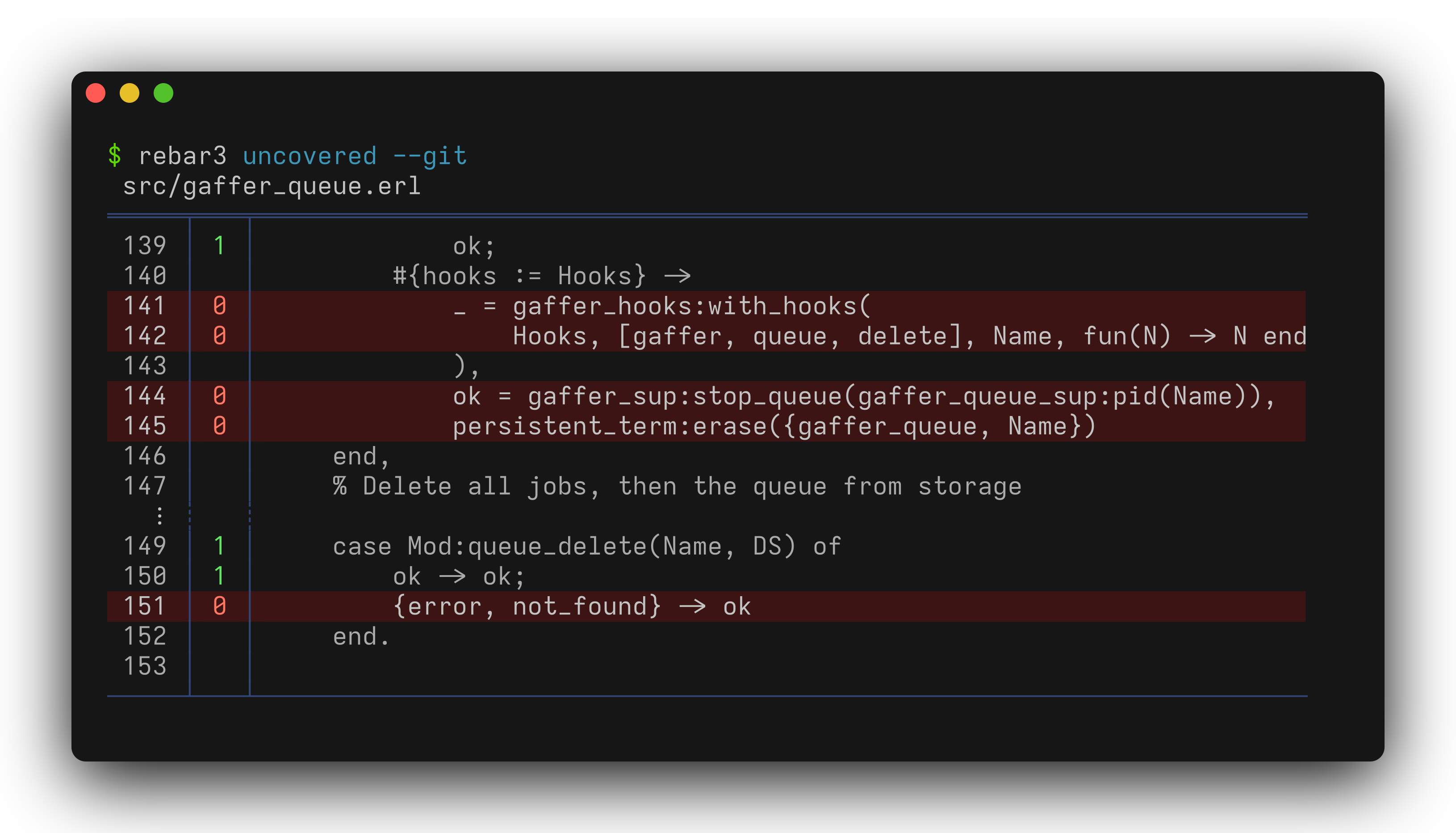 $ QUIET=1 rebar3 uncovered --git --format=raw --context=0 --counts=false